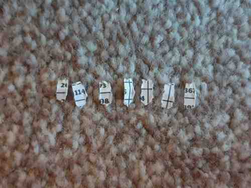 Earlier, we established that parallel feeding reduces the practical number of ways that pieces can be arranged, as the shreds are more legible than with perpendicular feeding. Rather than a brute force attack, an adversary would attempt further reduction methods. One such method would be effective when paper is folded. When paper is folded, these small shreds are actually two stacked shreds, as pictured below.